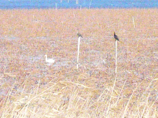 途中で沼の中に何羽かの白鳥を発見。その先で飛んでいる3羽の白鳥を目撃。